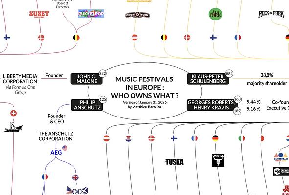 A vizsgálat megállapítása szerint Európa legnagyobb zenei fesztiváljainak több mint 150 eseménye közvetlenül vagy közvetetten négy vállalatcsoport fennhatósága alá tartozik: a Live Nation, a Superstruct Entertainment, a CTS Eventim, valamint az AEG (Anschutz Entertainment Group). Ezek a szereplők nemcsak fesztiválokat, hanem koncerthelyszíneket, jegyértékesítési rendszereket és promóciós hálózatokat is működtetnek.