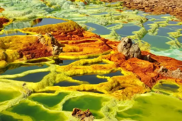 Az etióp Dallol, a Danakil-mélyföld része, már-már elviselhetetlen környezet. A vulkanikus terület élénk sárga, zöld és narancs színei mérgező gázok és ásványi lerakódások eredményei. A látvány lenyűgöző, ugyanakkor kíméletlenül emlékeztet arra, milyen szélsőséges tud lenni a Föld.