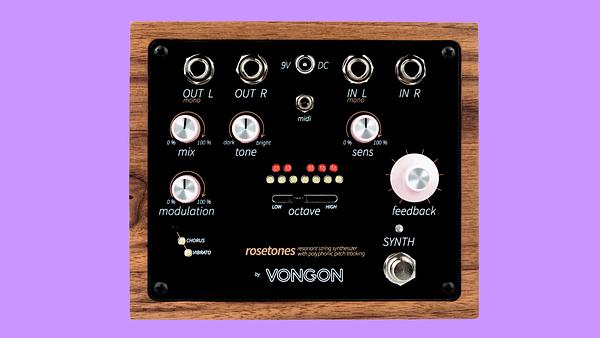 A Vongon ma kihozta a Rosetones pedált, amely félúton van a polifonikus rezonátorbank és a string-szintetizátor között. A cél nem a klasszikus delay–reverb–torzítás hármas bővítése, hanem az, hogy a gitárhangot selymes, húros szintitextúrák vegyék körbe – sztereóban, pedálformátumban. A motor lelke egy 12 szólamú, kromatikus rezonátorbank, amely folyamatosan figyeli a bejövő jelet, és a megfelelő hang megszólalásakor a hozzá tartozó késleltetővonalat gerjeszti. Ebből alakul ki a szimpatikus rezonancia, ami egyszerre tud finoman lebegő és nyersen zengő lenni. A kezelőfelület feszes: mix, tone (sötétebb–fényesebb karakter), sensitivity, modulation, low–high octave és feedback potikkal dolgozhatunk. A sustain és a feedback állításával jeges, hosszú hullámzásokat, monumentális lecsengéseket vagy rövid, pergő lüktetéseket hozhatunk ki. A csúszka a rezonancia „voice” hangmagasságát tolja el, így plusz harmóniák, fordítások és színezések érhetők el, a modulation pedig életet visz a rezonátorbankba, mozgást és mélységet adva. Két beépített FX is került bele: a Chorus finom, többhangos detuninggal ad ensemble-szélességet, a Vibrato pedig könnyű hangmagasság-ingadozást pakol a rezonanciára. A sensitivity és a feedback paraméterekkel szabható, milyen erősen gerjesztik a hangok a rezonátorokat, és meddig tart a sustain. Nem csak gitárhoz használható: a Rosetones TRS 3,5 mm-es MIDI-bemenetet kapott, így önálló, 12 szólamú string-szintiként is bevethető egy MIDI-kontrollerrel. A beállításokból kilenc hardveres preset menthető, a teljes jelút pedig sztereó. Első benyomásként a pedál kifejezetten kísérletező: a fuzz helyett rezonátorokba küldött gitárhang organikus vastagságot és néha pulzáló, visszacsatolásig kúszó textúrát ad. MIDI-szintiként még kevés a publikus anyag, de az irány ígéretes. A Vongon Rosetones már elérhető, az ár 449 dollár.